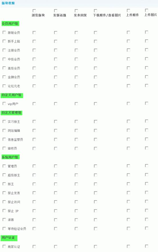 这里主要对版块的访问权限,发表主题和回复权限及附件上传和下载权限等进行设置。